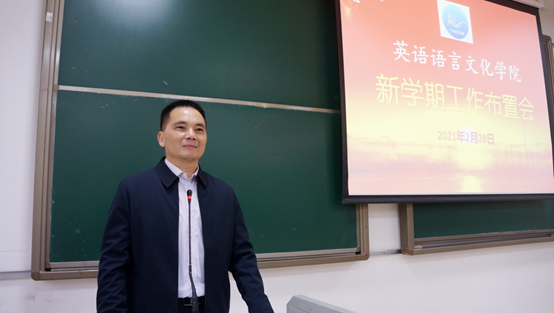 林绍雄代表学院领导班子向全体教职工致以诚挚的新年、新学期祝福,向挂职干部院长助理温柔柔同志和新入职的四位教职员工表示热烈欢迎,邀请他们分别进行简要自我介绍,指出机关干部到我院挂职,是大学党委对我院的肯定、期待、鼓励和支持,新同志们的加入,必定会为英文学院大家庭注入新的活力、带来更多的精彩。