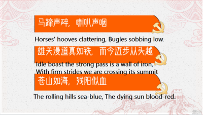 “长征中”小组通过英文翻译、现代汉语解释、描绘长征路线图等方式,讲解毛主席长征途中写下的《清平乐·会昌》《忆秦娥·娄山关》《七律·长征》《念奴娇·昆仑》《清平乐·六盘山》《沁园春·雪》六首诗词,不仅结合了英文学院学科专业特色,也清晰地展示了长征行进路线,帮助师生领略长征精神,领会“每一代人都有每一代人的长征路”的含义,倡导大家走好我们这一代人的长征路。