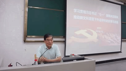 本网讯 7月13日下午,英文学院在北校区第二教学楼114室举行党建与学科发展专题报告会,邀请我校原党委书记、校长徐真华教授作题为“学习贯彻习近平总书记‘七一’重要讲话精神,推动新文科背景下外语学科的改革与发展”的专题报告。报告会由院长张欣主持,学院全体教职工出席。