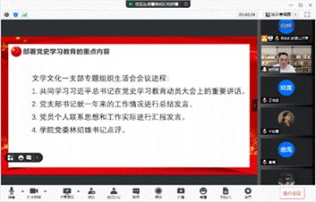本次会议认真总结了文学文化第一党支部党员党史学习教育的情况,支委会和党员同志们结合自身党史学习教育的情况和自身实际,彼此交流看法,认识自身不足,互相批评指正,明确了支部及党员今后的党史学习教育及其他工作的努力方向,取得了良好的活动效果。