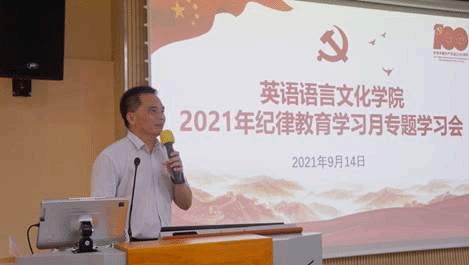 本网讯 9月14日下午,英文学院于新一教109召开2021年纪律教育学习月专题学习会,会议由学院党委书记林绍雄主持和主讲,英文学院教职工和部分学生参加了会议。