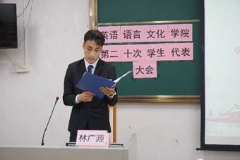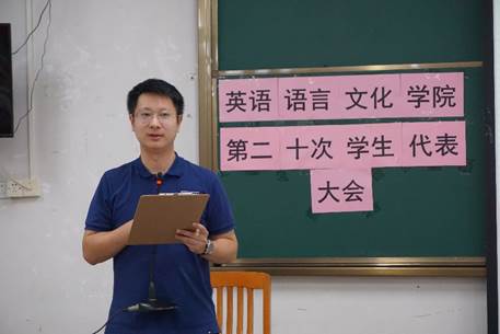 英文学院团委书记马骁在致辞中强调了,作为学生会的一员应承担“服务同学”的重要责任和使命,同时对新一届学生会委员提出建议,希望学生骨干严于律己,摒弃“做学生官”的思想。最后,他对与会的学生骨干和各年级代表表示感谢,并预祝英文学院第二十次学生代表大会获得圆满成功。