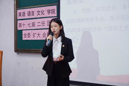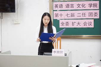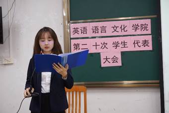 (右图)英文学院学生会轮值主席李盈盈作工作报告
