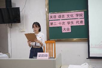 本网讯 9月16日下午4时,广东外语外贸大学英语语言文化学院第二十次学生代表大会于二教114成功举行。英文学院团委书记马骁、学生代表大会主席团成员及各年级学生代表参加了本次大会。会议由英文学院学生会学术创新中心负责人袁逸凡主持。