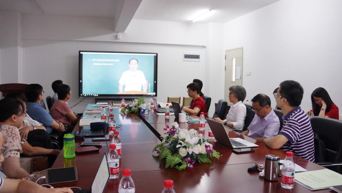 会议最后,大家集体观看了廉政教育片《中华人民共和国公职人员政务处分法解读》。十三届全国人大常委会第十九次会议审议通过的《政务处分法》,是新中国成立以来第一部全面系统规范公职人员政务处分工作的国家法律,将国家监察体制改革提出的实现对所有行使公权力的公职人员监察全覆盖的要求进一步具体化,对坚持和加强党的全面领导,强化对权力运行的制约和监督,构建一体推进“不敢腐、不能腐、不想腐”体制机制具有重要意义。同志们通过观看该教育片,全面深入学习了政务处分的相关法律法规,并深刻认识到作为公职人员必须加强自我作风、纪律建设的重要性。林绍雄希望英文学院领导干部带头、全体师生参与,认真学习《政务处分法》以及相关的法规制度,并用实际行动将其精神落实贯彻到政治生活和日常工作之中,切实增强遵纪守法、廉洁自律意识,共同努力构建学院风清气正的政治生态和良好氛围。