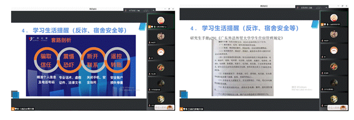 随后,王晶老师还针对校园安全等事项做出了提醒,包括谨防网络诈骗,电信诈骗,宿舍用电安全,晚归措施等,随后为大家介绍了学校心理健康中心咨询途径,并在研究生年级开设辅导员聊天室,为大家的校园安全打好预防针,提高同学们生活学习质量,为营造和谐健康的校园生活环境。