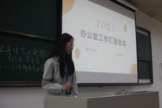 学术创新中心介绍了该部门主要赛事活动,提出“助团结、共建设、齐给力,博先进”四个目标;文体部讲述相关活动的举办情况,并肯定成员们的团结与劳动;宣传与新媒体中心总结了部门参与的各项工作,阐述收获和体会。