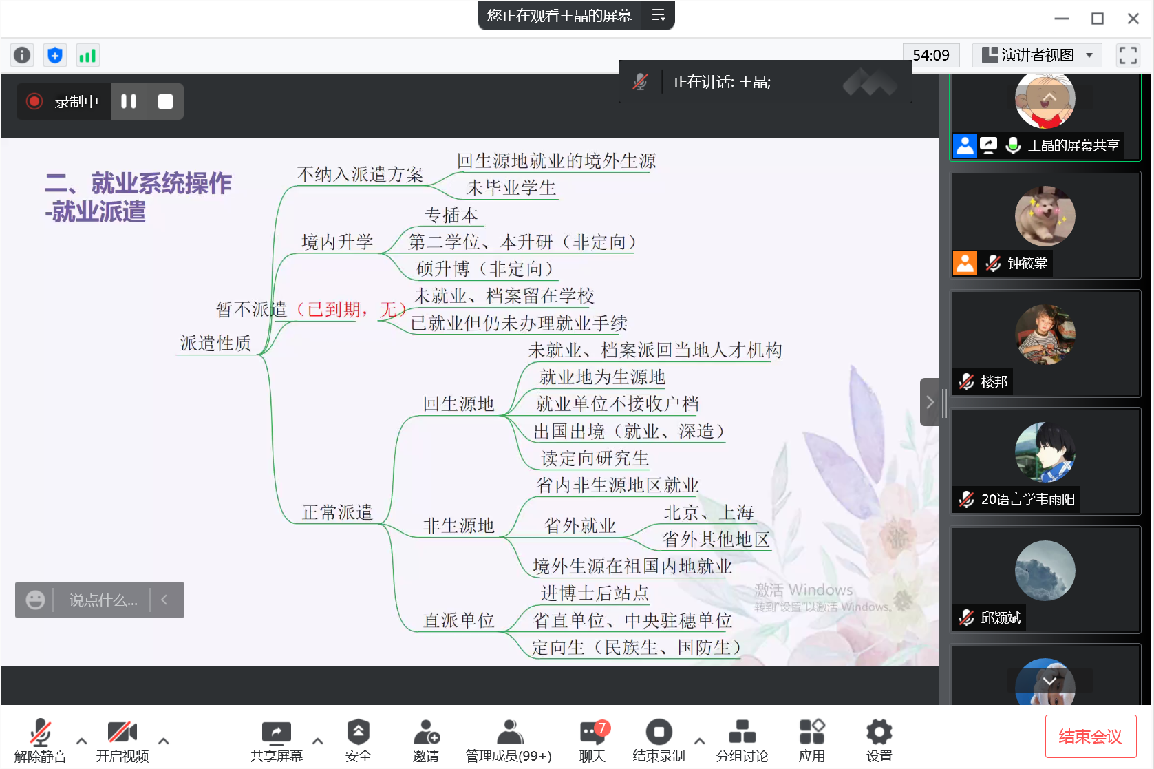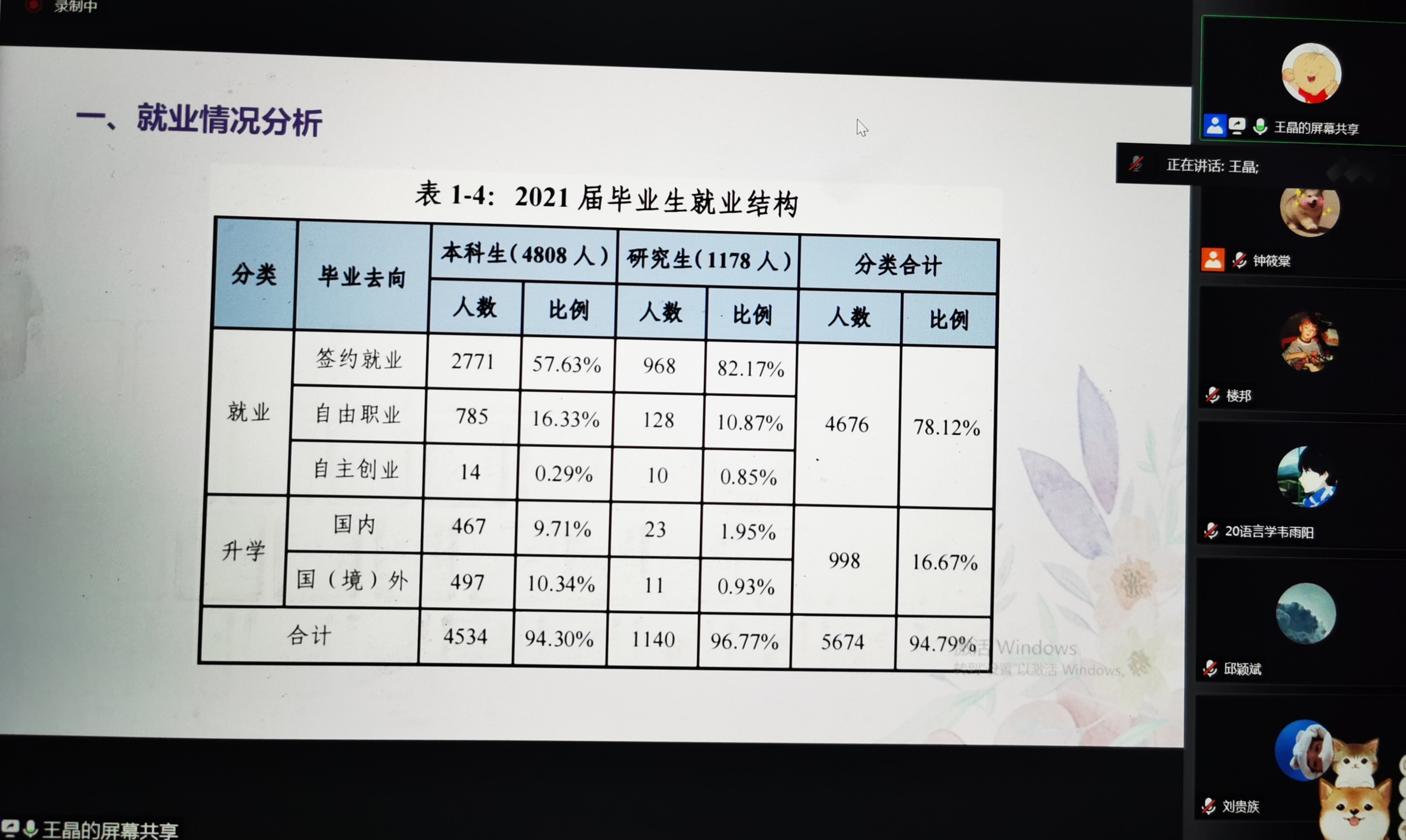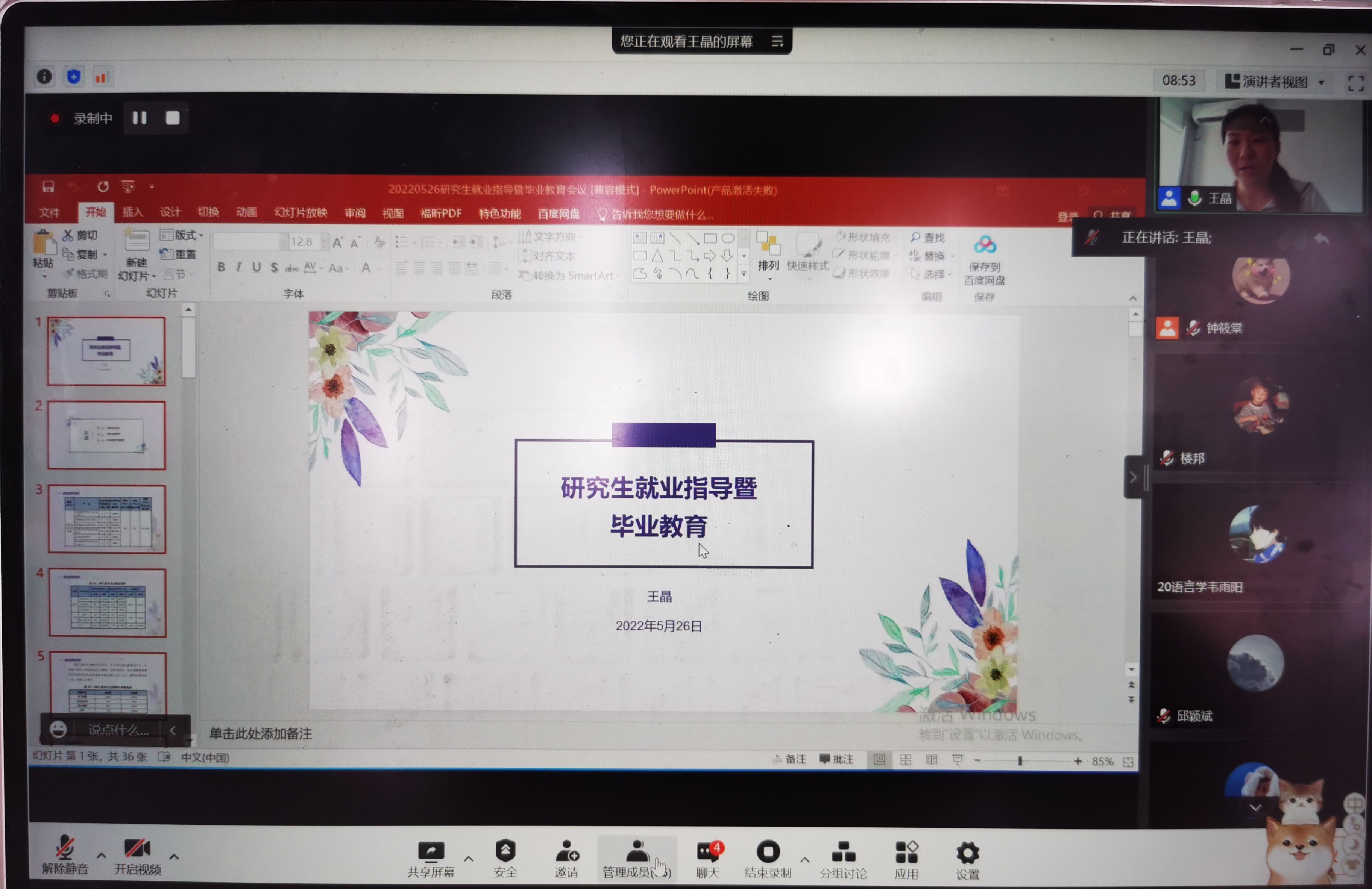 为指引2022届研究生顺利毕业与开展离校工作、动员2023届毕业生提前准备,让学生们清晰就业形势,把握就业机会,提高就业质量,5月26日下午,英语语言文化学院研究生就业指导暨毕业教育大会在腾讯会议平台顺利召开。研究生辅导员王晶老师主讲,英文学院研二、研三全体同学参与。