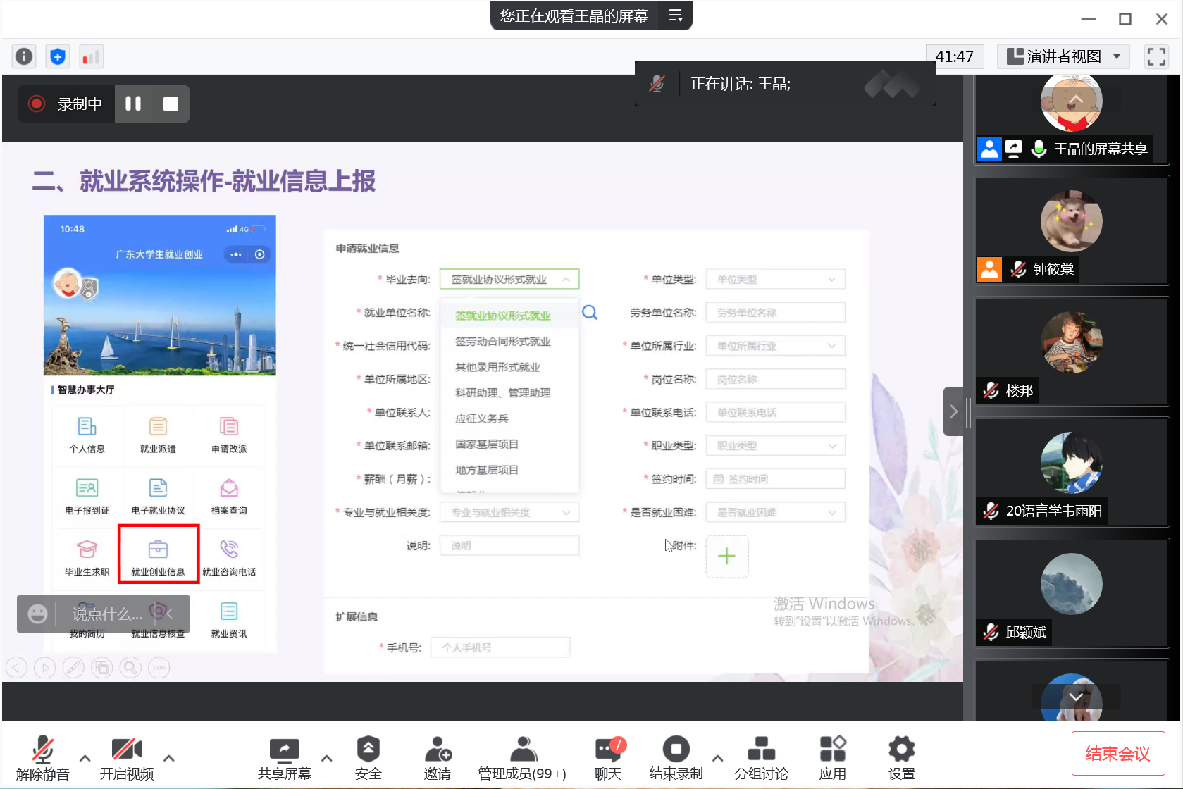 随后,王晶老师向大家介绍了学校就业系统的具体操作,对毕业生就业派遣、毕业生报到证、就业协议书等就业相关资讯、政策变化与毕业工作安排进行了深入讲解,详细剖析了就业协议填报与就业协议签订的注意事项与具体细节,以及小程序填写页面的具体流程,学校关于毕业生就业派遣的具体要求,档案接受材料的具体要求与规范等等,为毕业生做好毕业就业、档案派遣相关工作提供了全面的指导,为毕业生就业求职做好充分准备提供了有益的帮助。最后,王晶老师还强调了毕业生离校工作布置与工作日程,为大家在毕业最后阶段如何做好离校工作,强调研究生以科研为主,积极求职提供了明确的方向。