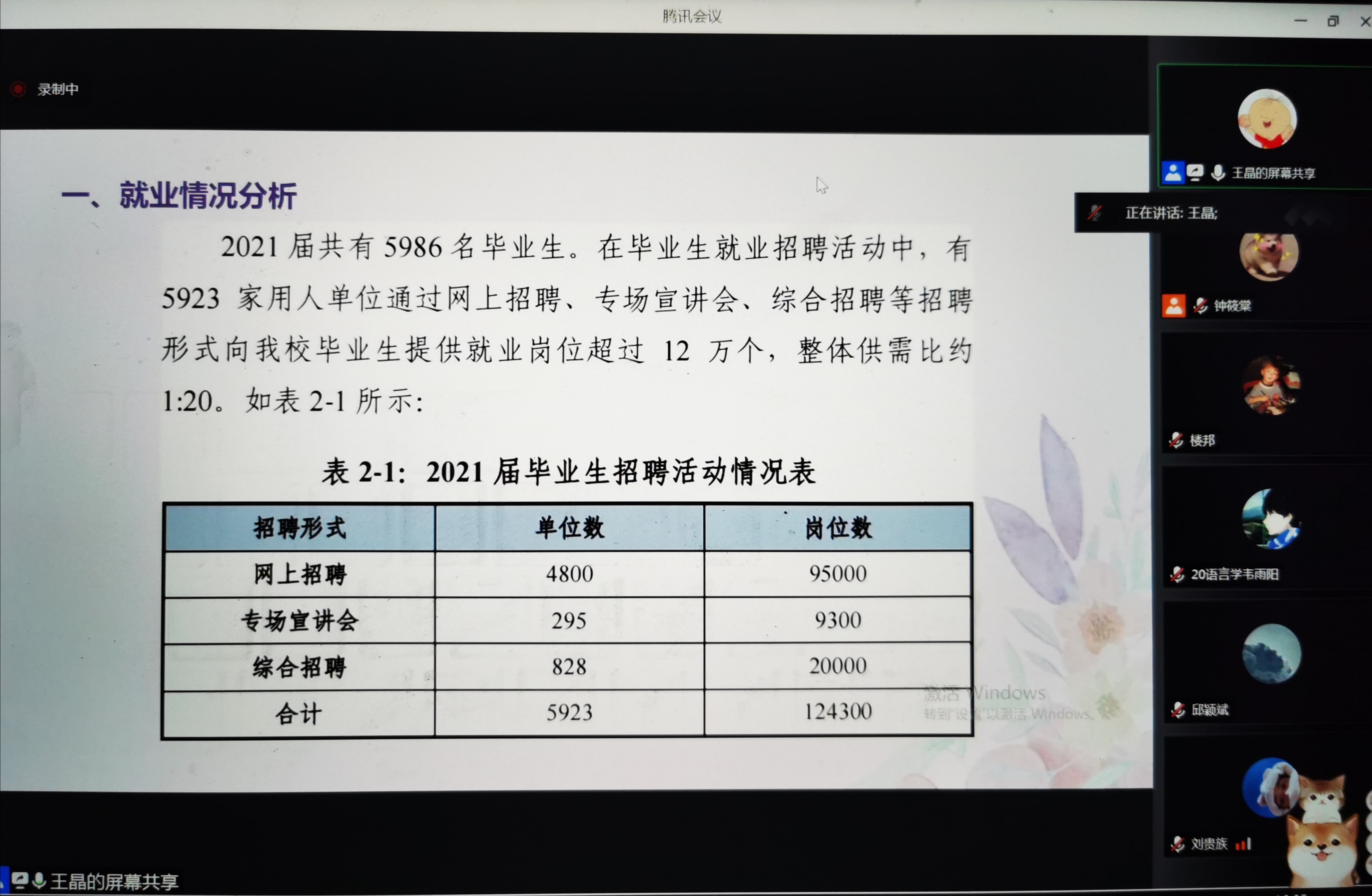 大会开始,王晶老师首先对近年英文学院研究生就业情况进行了分析与讲解,介绍了今年研究生就业的总体情况以及就业形势,王晶老师针对2021届毕业生就业结构,学校招聘会举办情况,毕业生平均薪酬以及毕业生就业行业去向等重要就业信息做了解析,还向大家展示了近三年英文学院研究生毕业生就业的情况,为了解本专业去向的实际情况,选择就业行业与就业岗位提供了诸多借鉴。