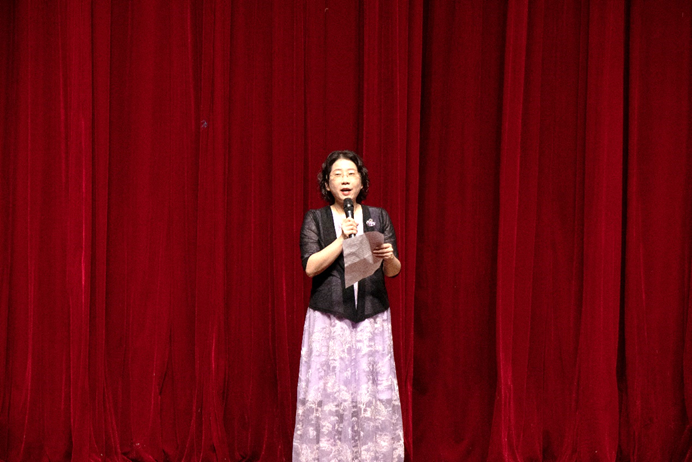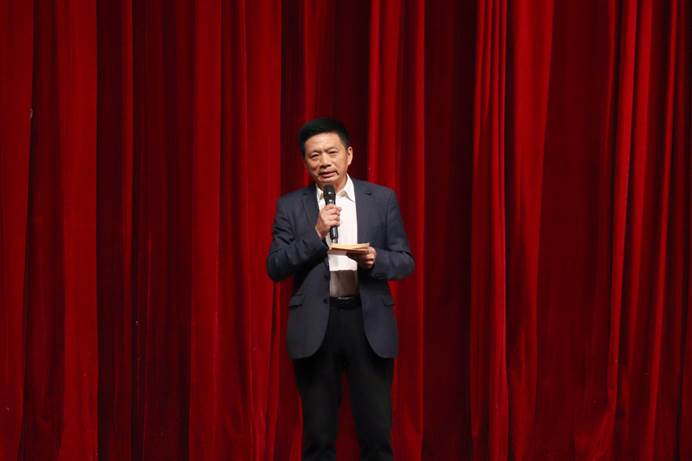 正式开演前,刘胡敏教授进行了开幕致辞。她表示,今天晚上对许多英文学院的师生和许多校友来说是美好的时刻,因为戏剧大赛给大家带来了很多美好的回忆。戏剧大赛受疫情影响暂停了两年,今晚终于再次被搬上云山会堂的舞台。此次戏剧大赛的再次启动得益于校外专家的支持、学院老师和2019级全体学生的共同努力,尤其是文学系老师们的大力支持。她特别感谢有着英文学院“戏剧之父”之称的毛思慧老师从汕头来到广外,20多年来一如既往地支持戏剧大赛。她说每一年除了向往观看戏剧大赛的演出之外,还期待听毛老师的点评。之后她感谢了在座的其他评委。因为4个剧目均是与抗疫相关的,两个改编,两个原创,因此最后刘教授借用今年北京冬奥口号“Together for a shared future”(一起向未来),来引出今年戏剧大赛的口号:Fighting diseases together for a shared future”(一起抗疫向未来)。