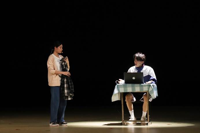 该剧剧名为L_ _ E,有两种解读,一为“LOVE(爱)”,一为“LIFE(生命)”,这也正是剧目的两大冲突点:需要疼爱的儿子,需被拯救的生命。饰演母亲的张惠娴塑造了一个很真实的一线工作者,她为救治病人感到骄傲,但也因无法陪伴儿子感到自责,她深知医生应毫无顾忌的救死扶伤,但也会在抗疫一线感到恐惧。她扮演的母亲在舞台上落泪之时,现场观众无不感动。儿子的扮演者蔡卓霖也毫不逊色,他用生动的表情和夸张的肢体,形象地表现出一个高中生的叛逆。作为母亲日记的朗读者,他带着观众们像看视频一般,观看母亲日记记录的故事,他一个响指故事暂停,一个响指故事快进,顺畅地串接了两个时空。