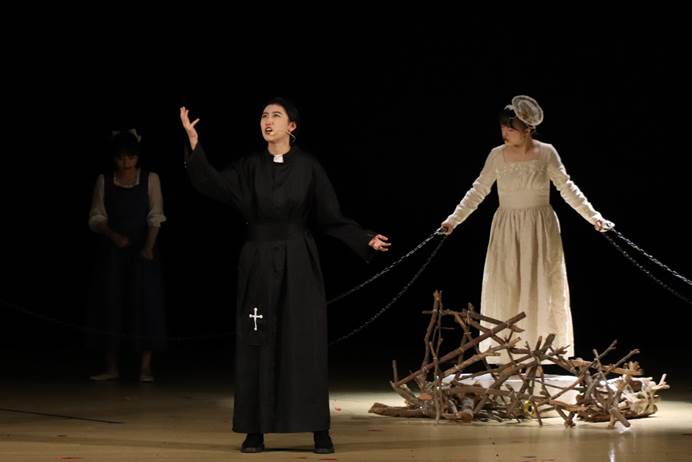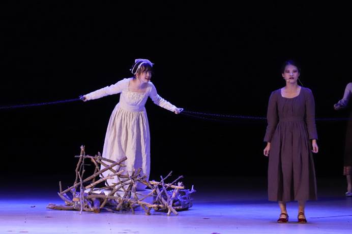在音效方面,乌鸦与老鼠的叫声充分营造了鼠疫泛滥的阴森感,回荡的钟声成功地将观众拉入教堂现场,抗疫场景中的激昂音乐彰显了医学的伟大,将剧目推至高潮。该剧考究的道具制作和田园风的妆造也可圈可点。逼真的壁炉使观众仿佛身临17世纪英国乡村,木柴堆与拴人的铁链复刻了女巫审判的现场,结合冷色调的灯光,营造了审判的压抑氛围。