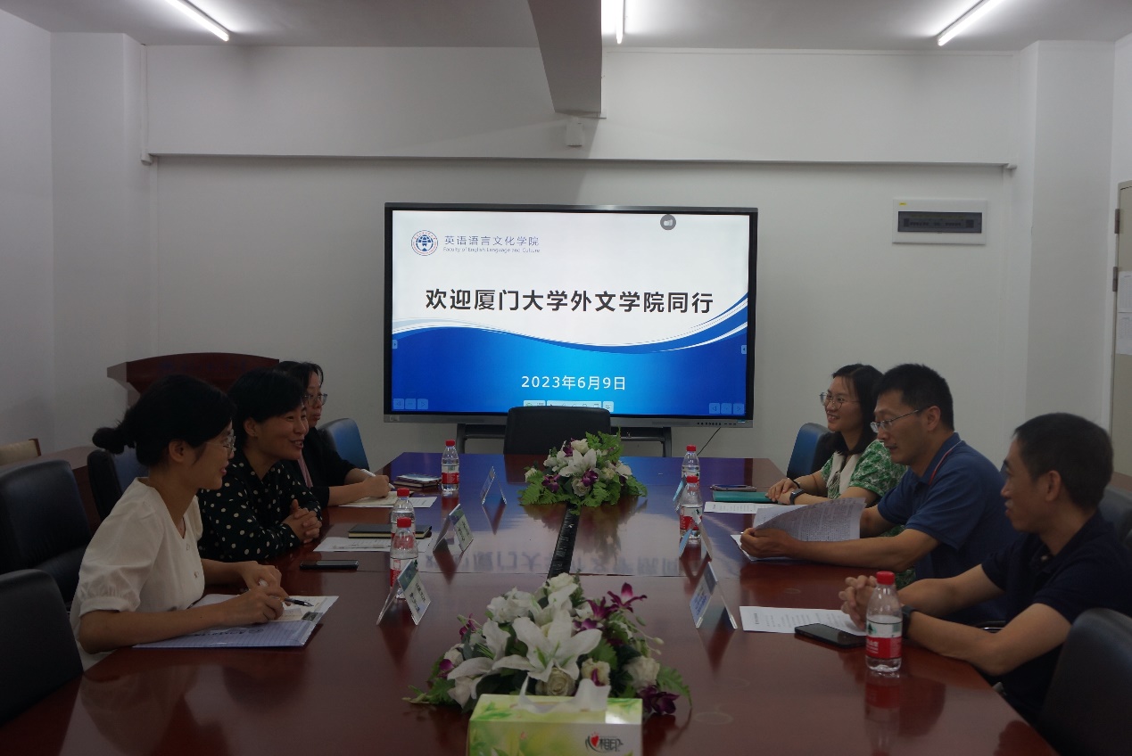 本网讯 2023年6月9日上午,厦门大学外文学院副院长刘悦、外语教学部副主任黄玲毅、外事秘书汪怡一行3人来我院调研,我院副院长李成团、外事秘书郑常青、科研秘书陈淑君与他们进行了座谈。双方就学科建设、人才培养、国际交流、科研管理等方面的实践经验展开了热烈的交流。