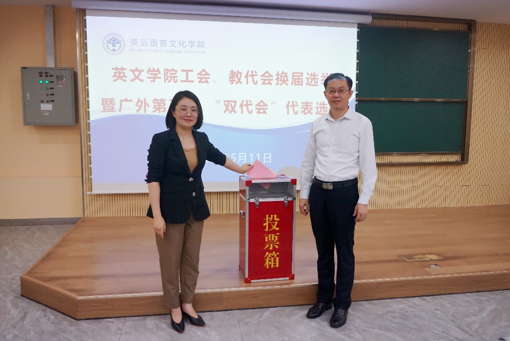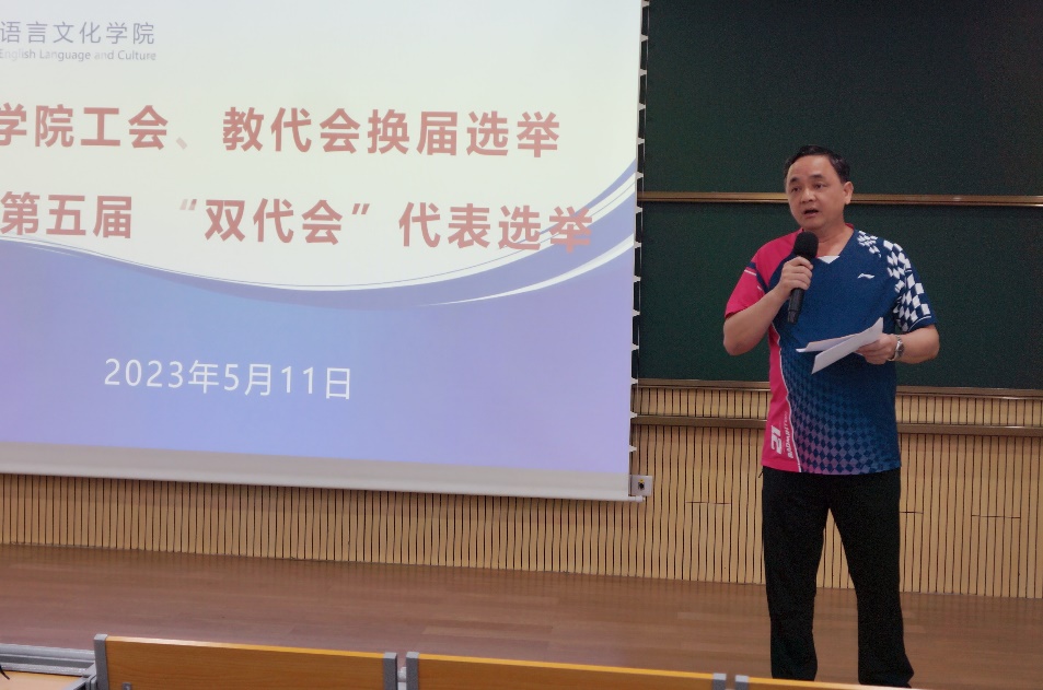 本网讯 5月11日,英文学院在白云山校区第一教学117室举行学院工会、教代会换届选举暨学校第五届“双代会”代表选举工作会议。会议由学院五级组织员何伟儒主持,学院工会主席夏玉坤作工作报告,学院党委书记王则唐作总结讲话。学院全体教职工、工会会员出席会议。