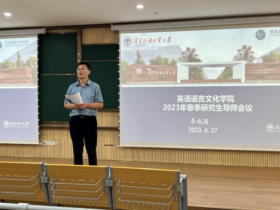 本网讯 6月27日上午10点,我院在第一教学楼南楼109时代讲堂举行了学院研究生导师会议。本次会议由英文学院李成团副院长主持,全体研究生导师及研究生办公室工作人员出席了本次会议。会议围绕研究生培养中出现的问题与解决方案、优化研究生的课程设置、组建不同的课程群、修订和优化培养方案和教学大纲、科研创新团队组建、制定详细的教学评价体系和标准等方面议程进行了探讨。