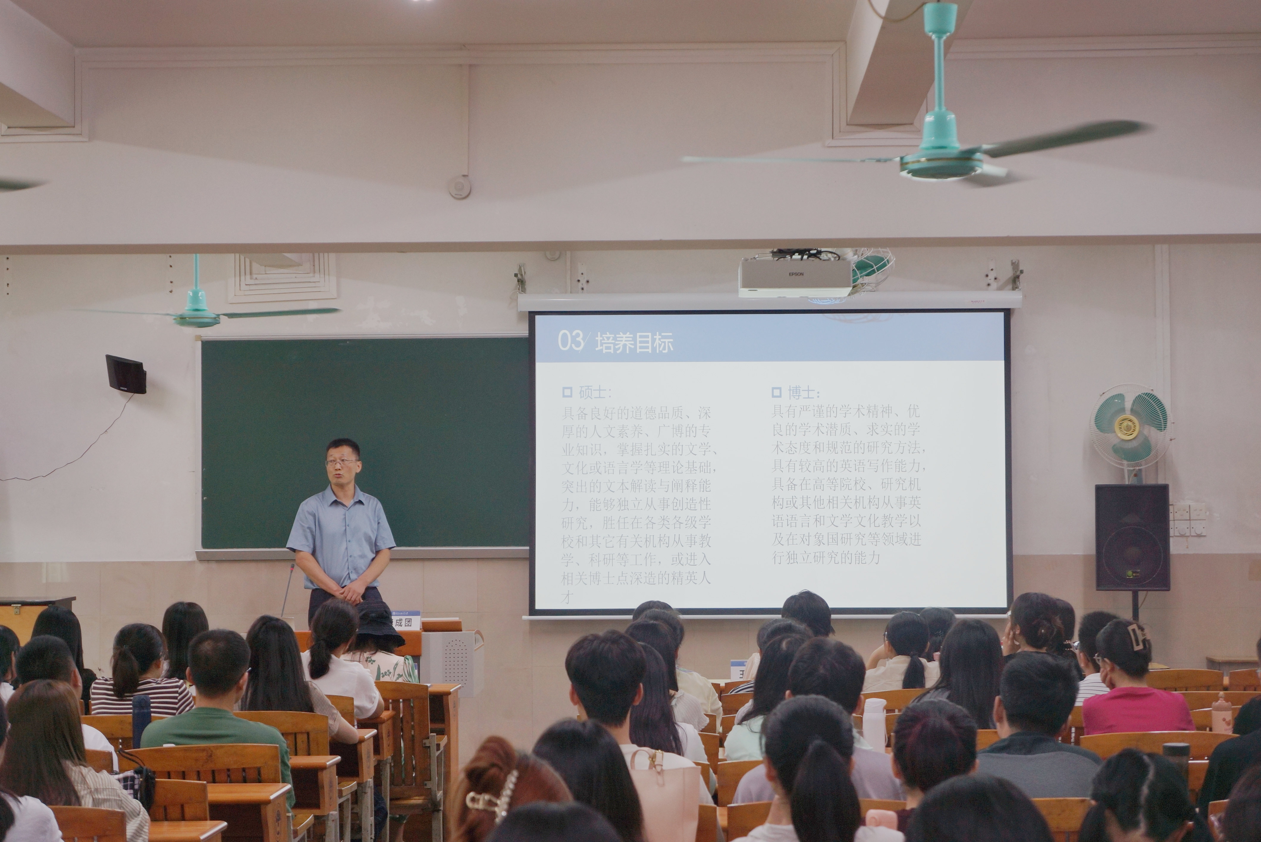 本网讯 2023年9月5日上午,我院组织2023级研究生开展新生入学教育,学院李成团副院长、王迪副书记、研究生办公室老师、研究生辅导员以及全体英文学院研究生新生出席本次会议,本次会议由英文学院研究生办公室主任李敏子主持。
