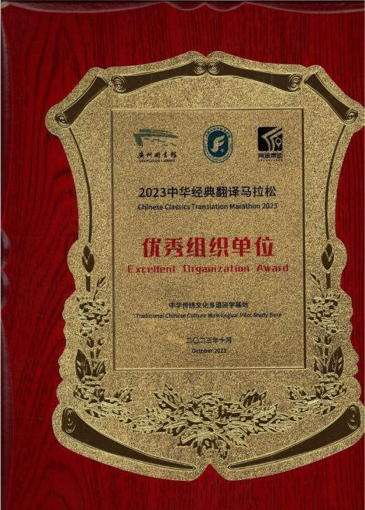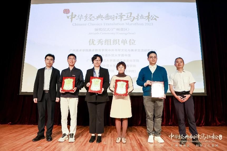 本网讯 “云对雨,雪对风,晚照对晴空……”10 月 22 日,伴随着《声律启蒙》悠扬的旋律,“2023 中华经典翻译马拉松”(广州赛区) 颁奖仪式在广州图书馆(以下简称“广图”)举行。活动当天,共有100 位参赛选手在广图同场竞技,共同传译中华经典。最终,我校张周薇、丘越等 12 名学子胜出,喜获一等奖两项,二等奖两项,三等奖八项,在广图 2023 年度 24 名“中华文化传译人”中占领“半壁江山”。我校英语语言文化学院、英语教育学院、图书馆领导出席活动并代表学院(单位)受领“优秀组织单位”奖牌。英文学院方开瑞教授,翻译与国际传播研究中心主任潘莉教授担任活动嘉宾。