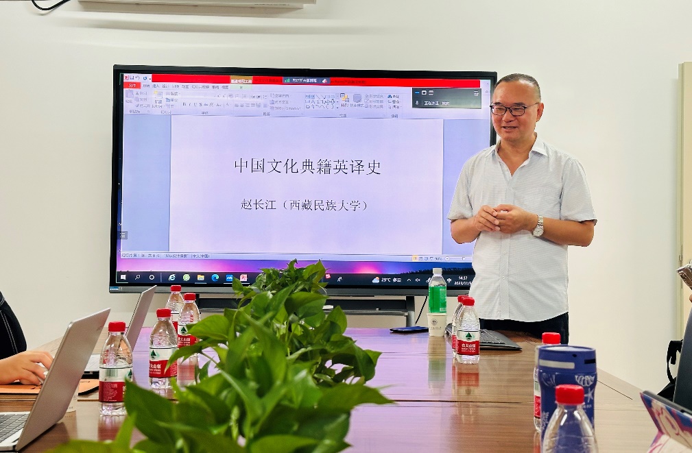 本网讯 2023年11月8日下午,中国英汉语比较研究会典籍英译专业委员会副会长、西藏民族大学高原学者特聘教授赵长江应广东外语外贸大学英语语言文化学院邀请,在第一教学楼北楼446李筱菊教师发展中心做了题为“中国文化典籍英译史”的学术讲座。讲座由英语语言文化学院文化系主任许景城博士主持。