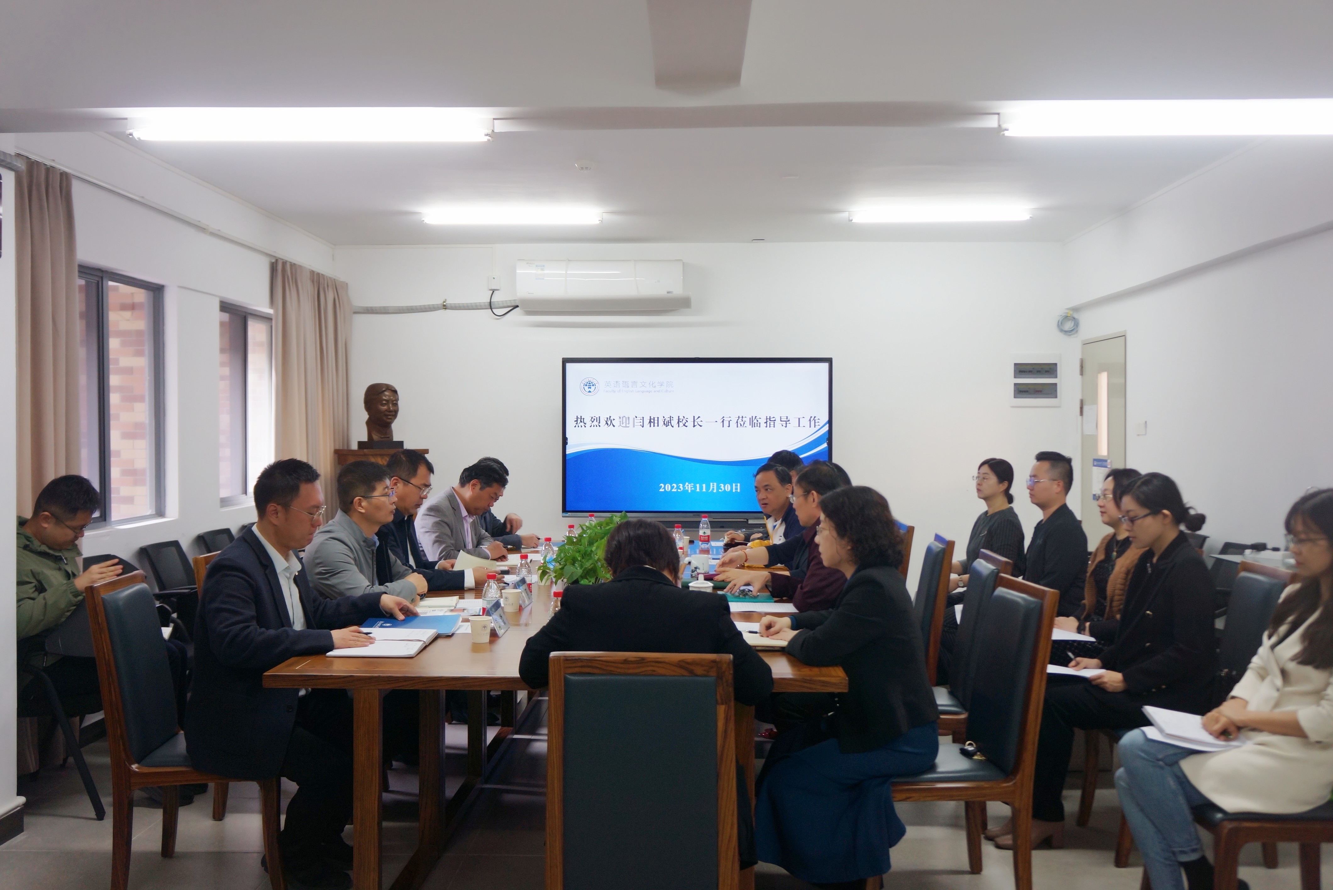 闫相斌校长对学院工作表示肯定,希望英文学院勇于担当,对标高端,瞄准前沿,引领我校外语学科高质量发展,大力助推外语学科“冲一流”。闫相斌校长还就拔尖人才队伍建设、重大科研项目培育和体制机制完善等方面提出了重要的指导性意见。