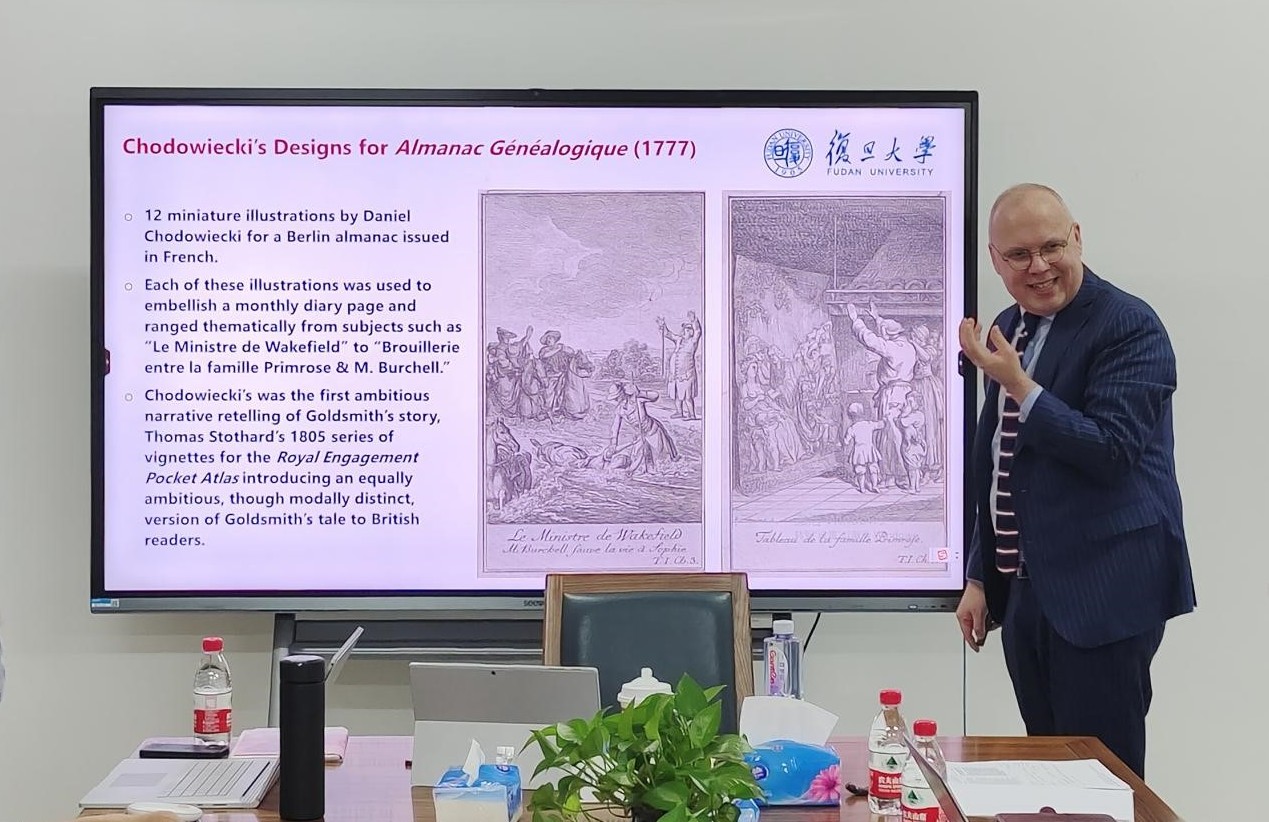讲座中,Sandro Jung教授系统爬梳了《威克菲尔德牧师传》在1767至1802年间插图本的出版脉络,以视觉叙事的角度反观文本意义,探究不同版本的插图在引导意义生成和提供价值评判等功能上的差异,最终不断重组乃至重塑戈德史密斯的叙事。特邀评论嘉宾傅修延教授表示,Sandro Jung教授从视觉叙事角度解读小说文本,与我国著名学者赵宪章教授提倡的“文学图像论”有异曲同工之妙,都强调语图符号之间的关系,从而为文学研究的跨媒介批评提供了新模式。随后,在场师生就“视觉批评”“视觉叙事”“元文本”等议题与Sandro Jung教授展开深入的交流讨论,收获颇丰。