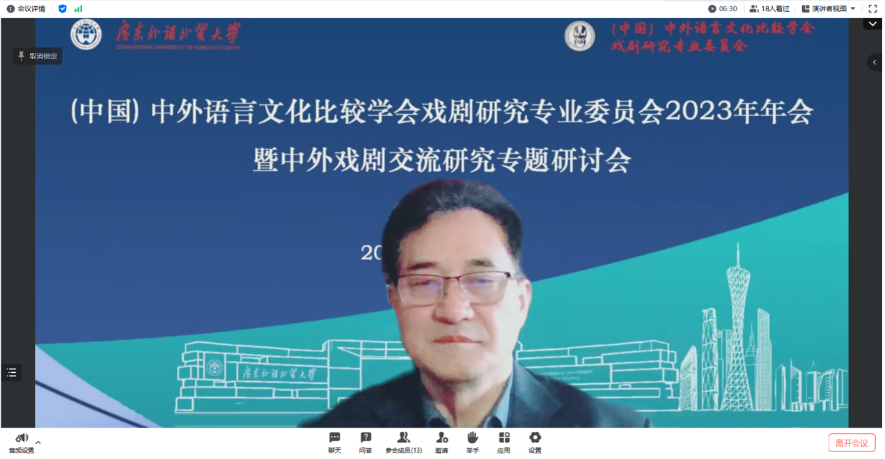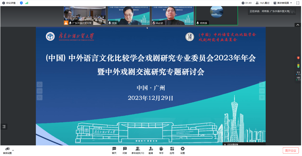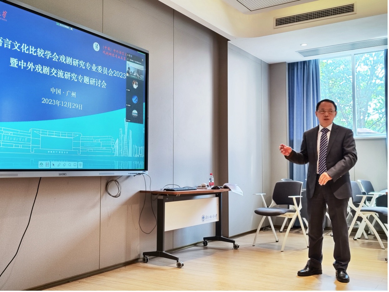12月29日,(中国)中外语言文化比较学会戏剧研究专业委员会2023年年会暨中外戏剧交流研究专题研讨会以线上线下相结合的方式在我校召开。此次会议由(中国) 中外语言文化比较学会戏剧研究专业委员会主办、广东外语外贸大学外国文学文化研究院、英语语言文化学院承办,阐释学研究院协办。相关领域专家、学者齐聚一堂,聚焦中外戏剧交流与发展,共同探讨中国戏剧发展的新面向、新机遇、新挑战和新对策。