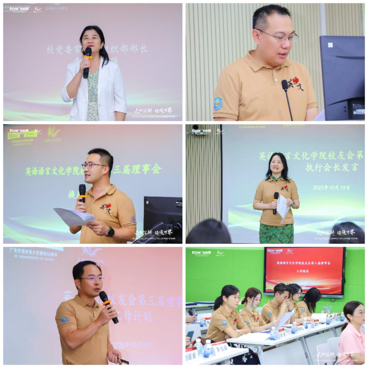 马缨表示,英文学院是“英文人”的共同家园,传承和发扬“英文人”的奋斗品格和创业精神是每一届英文学院校友会的重要工作。值此建院60周年之际,新一届学院校友理事会要坚持诠释并发扬好广外“英文人”的精神底色,这是学院最宝贵的财富,也是我们共同的骄傲。第三届理事会秘书长官敏发校友作理事会工作计划报告,他表示,历届英文校友的凝心聚力为英文校友工作开创了良好的局面,新一届理事会将联合校友加强互动,发挥好对学院和在校师生的担当,展现校友对学院及师生的支持,为学院和师生提供“学术分享、经验分享、资源分享”的高质量发展平台,着力会务建设和宣传工作,打造英文校友会的专属IP,赋能校友与在校师生的凝聚力和向心力,为英文学院和校友会的持续高水平发展共同努力。