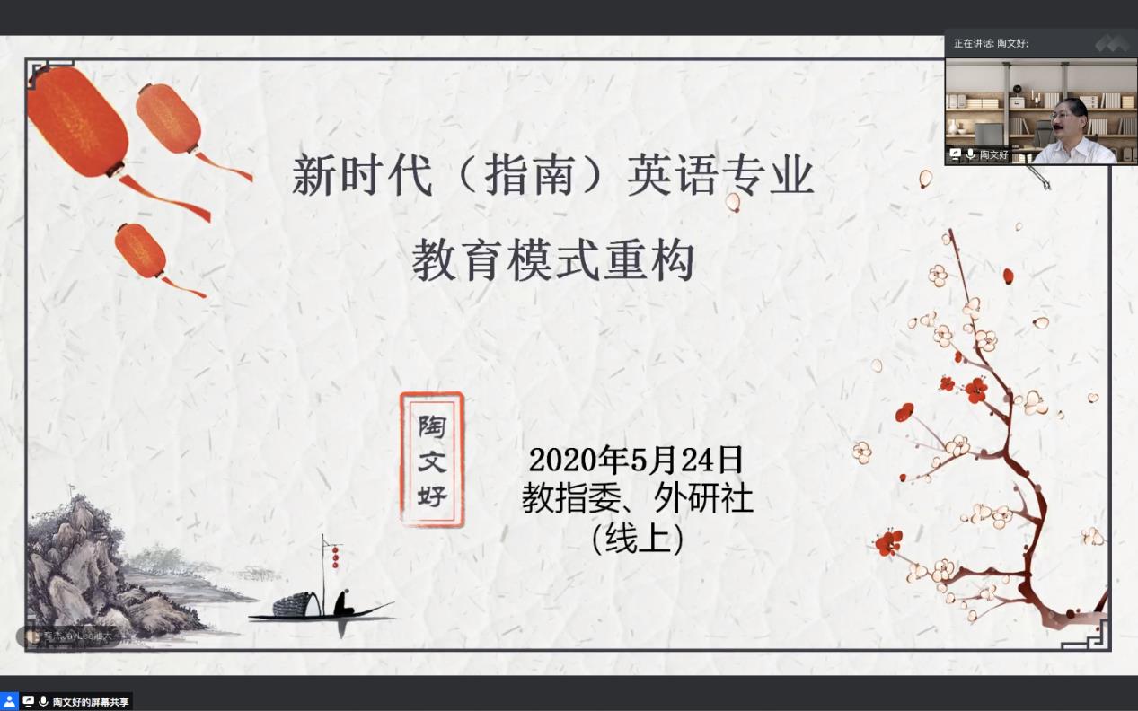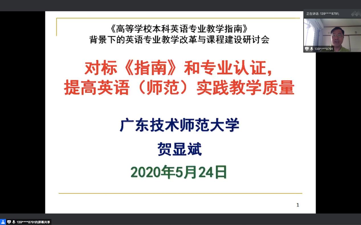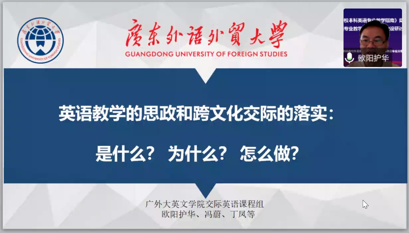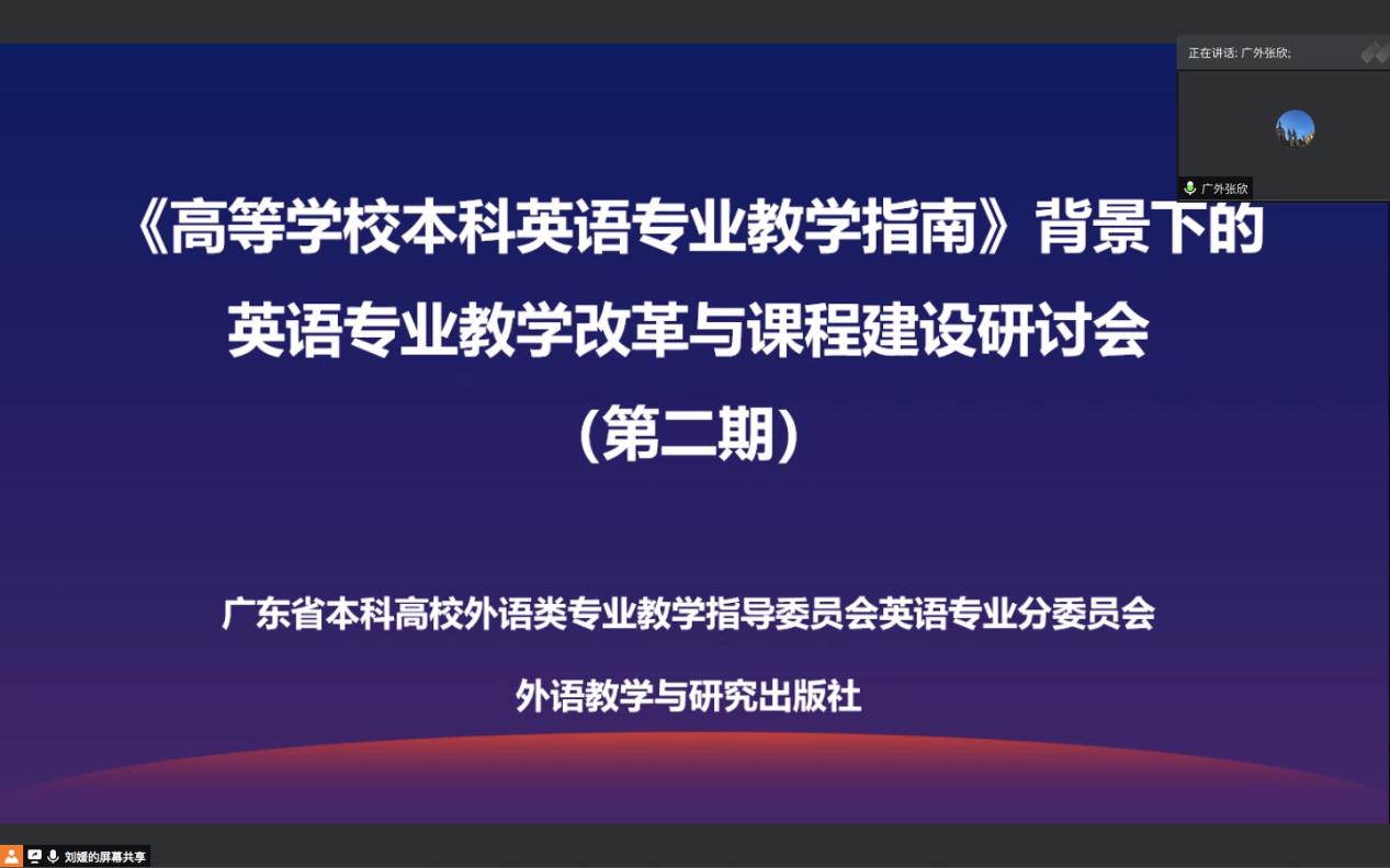本网讯 5月24日上午,“《高等学校本科英语专业教学指南》背景下的英语专业教学改革与课程建设研讨会”第二期顺利召开。在继第一期对《指南》的权威解读之后,第二期会议着重于“广东省高校英语专业指南落地分享和交流”。广东省本科高校英指委邀请了广东外语外贸大学英语语言文化学院欧阳护华教授、北京师范大学珠海分校外国语学院院长陶文好教授、南方医科大学外国语学院院长李清华教授以及广东技术师范大学外国语学院院长贺显斌教授,与大家分享了不同类别院校各具特色的专业发展和课程建设方面的实践和思考。广东省本科高校英指委主任委员、广东外语外贸大学英语语言文化学院张欣院长在会上致辞,广东省本科高校英指委秘书长、广东外语外贸大学英语语言文化学院副院长韩锐副教授主持了本次会议,全国各高校近300名英语专业教师参加了此次线上的研讨交流活动。