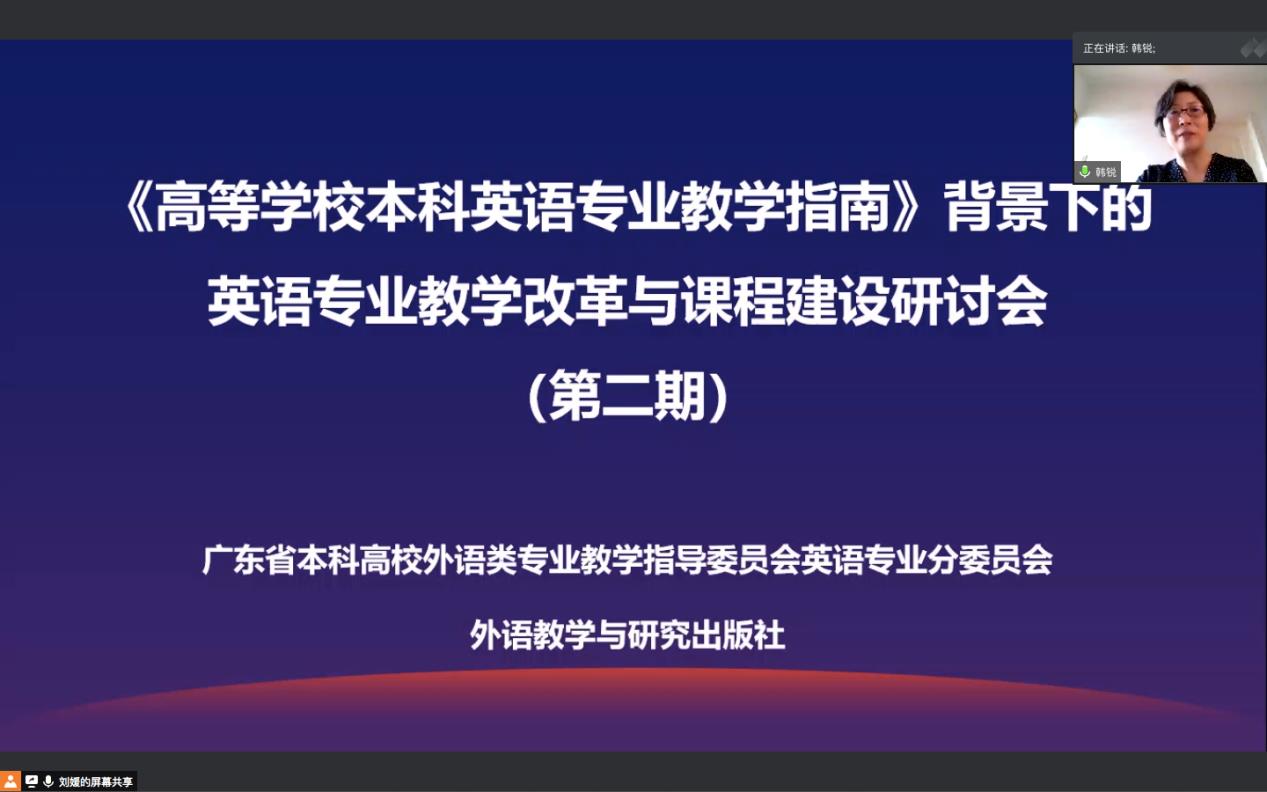 主持人韩锐代表广东省本科高校英指委感谢专家们的分享,并简要介绍了广东省英语专业的整体情况和广外国家级一流本科英语专业的建设情况。省内50个英语专业建设点将在专业《国标》和《指南》的规范和指引下,应对国家对英语人才的多元化需求,结合自身特点,探索差异化发展道路,共同推动英语专业革新发展。