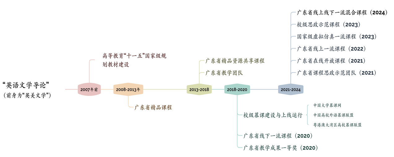 一二年级必修课为“英语文学导论(上、下)”,其前身为“英美文学”,荣获多项省级课程称号(建设历程详见下图)。课程配套建设了省级在线开放课程和国家级英语戏剧舞台实践虚拟仿真实验平台。三年级专业方向必修课为英国文学史和美国文学史。