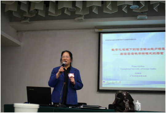 19日下午,陈建平教授和王桂珍教授代表英文学院在两场专题发言中分别做了非常精彩的发言。陈建平教授在“英语类专业国家质量标准与课程建设”的专题发言中做了“基于新的发展形势,实现我国高校英语专业转型升级”报告。他的发言从我国英语教育的现状出发,探讨英语专业应着重转型升级,培养三大类高端人才,以适应国家社会经济发展要求。在“以语言输出能力为导向的课程教学模式”这个专项论坛上,王桂珍教授介绍了广外独具特色的英语语音课程教学模式实践情况:通过“多媒体辅助课堂教学和网络自主学习”相结合的教学模式来促进和增强学生的英语语音学习。