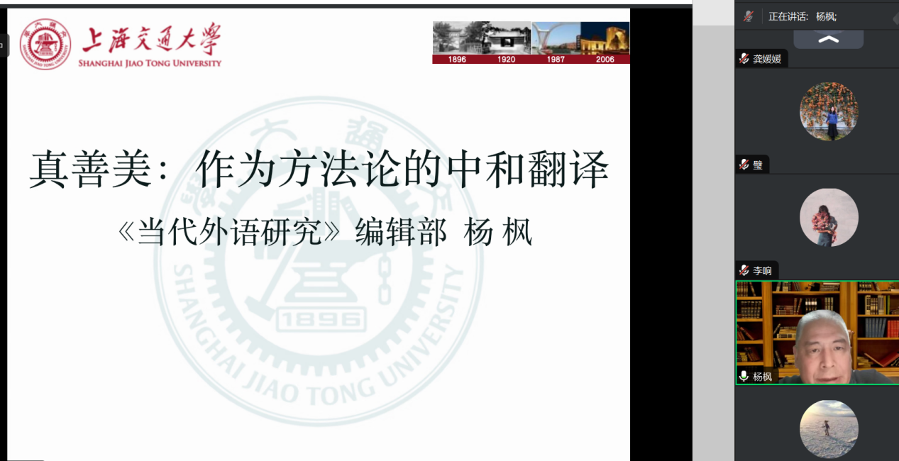 本网讯 2023年12月19日,广东外语外贸大学英文学院翻译系“三进”专题教研活动系列讲座“什么是中和翻译”在线上顺利举行。《当代外语研究》主编、上海交通大学外国语学院博士生导师杨枫教授担任主讲嘉宾,英文学院翻译系主任潘莉教授担任主持人。