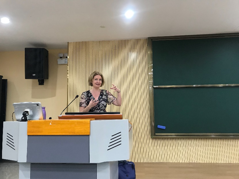 Sasha Calhoun博士关于语音象征的研究十分新颖,引人深思,提供了新的研究视角。讲座结束后,大家反映热烈,双语认知与发展中心梁利娟教授、林洁绚副教授、杨洋副教授和英文学院多位师生,提出了许多高质量的问题,Calhoun博士一一予以详尽的解答,现场互动交流充分。最后,王新清博士对讲座做总结发言并代表听众向Calhoun博士表达了真诚的感谢。讲座为与会师生打开了语言学研究的新视野,开拓了学术研究的新思路。