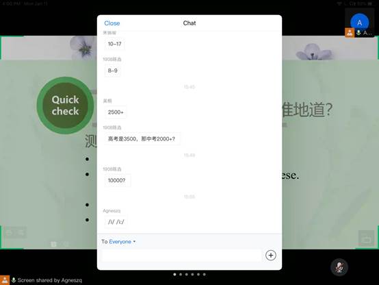 唐子茜老师先带动同学们积极讨论,提出在英语口语方面遇到的困境,接着分别针对词汇量不足、语音语调不标准、语法不正确、中式英语等具体问题为同学们进行解析并提出相应解决方案。在此过程中,唐子茜与同学们频繁互动,并切实带动同学们进行自我评估和训练。