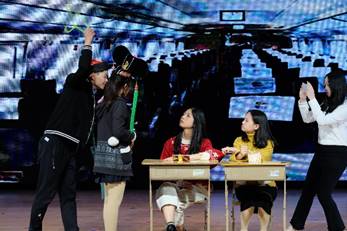 有趣的中场游戏结束后,晚会进入到第二部分。院模特队和院歌队联手带来“广外维密秀”——Tik Tok。黑白方块闪烁的炫酷舞台、踩着“Tik Tok”节奏的音符和步伐结合在一起为观众带来了一场视听盛宴。1812班带来的话剧《Youth Return》,融合舞蹈元素,用轻松愉快的方式讲述梦想与现实冲突的沉重,强调坚持梦想的重要性。随后,院舞队带来激情四射的舞蹈——Me, Myself & I,院歌队带来文艺的歌曲串烧《Time Traveler》,全场气氛高涨