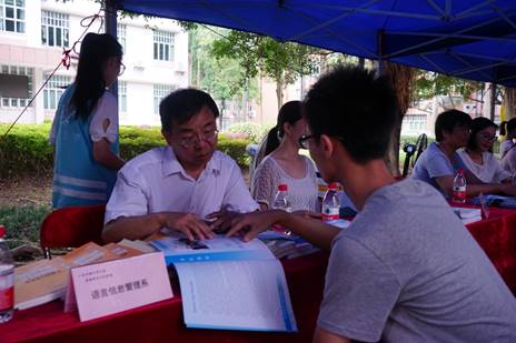 本次宣传中,学院按系部设置分语言学系、语言信息管理系、英美文学系、英美文化系、翻译系、旅游英语系共六个咨询处,各系主任及教师代表耐心地为前来咨询的考生和家长介绍学院专业发展情况、答疑解惑并提供参考建议。英文学院院长温宾利、院党委书记王斌、副院长姜琳、党委副书记何伟儒及学院全体辅导员全程参与咨询接待工作。