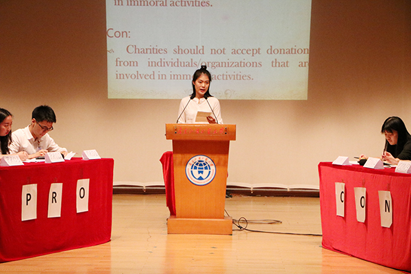 经过前两轮的激烈角逐,六位选手脱颖而出,进入了最终的辩论环节。围绕着“慈善机构该不该接受以非道德手段获取的捐款”这一话题,双方针锋相对、据理力争。正方认为,慈善事业的初衷是帮助有需要的人,捐款的用途是正当的,故不必苛求其来源是否有违道德。反方则提出,接受以非道德手段获取的捐款本就与慈善的本意相冲突,且慈善机构应是社会的道德表率,当然不该对此听之任之。在辩论过程中,1403班钟雯步步为营的追问以及1406班李欣璐暗藏玄机的反驳都十分精彩。双方陈述的选手们亦是沉着回答、冷静应对,选手们的思辨能力和应变能力展现的淋漓极致。