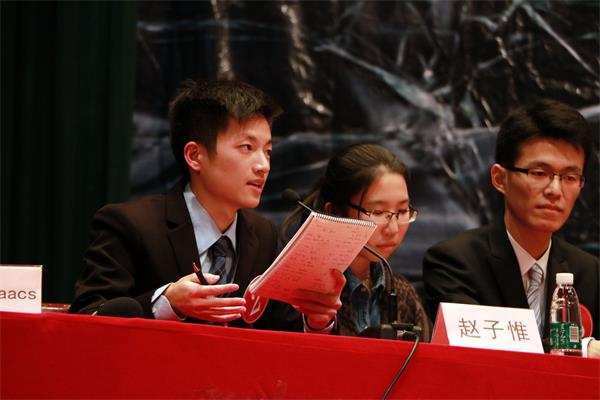 第一环节是双方一辩陈述观点,第二环节是互问互答的攻辩环节。辩手们在“does”与“could”的辩题之争中展开了激烈的辩论,同时也掀起了观众席的阵阵热潮。其中,正方一辩齐子屹在论述的过程中不但幽默随性,还引用了《道德经》中的名句“天下皆知美之为美,斯恶已。”观众们不禁暗暗为译员捏了一把汗。但值得一提的是,译员蔡楚婧运用准确的英语表达巧妙地化解了语意翻译上的难题,而且,她起伏的音调更是传神地体现了辩手的语气。在整个流畅的传译过程中,她并没有时时低头看笔记,而是大方自信地侃侃而谈,与对方辩友进行了适当的眼神交流。“技”压群雄,亦“势”压群雄的她,赢得了现场观众热烈的掌声。