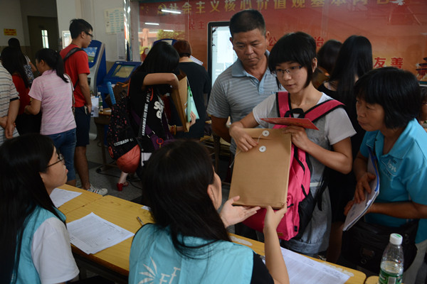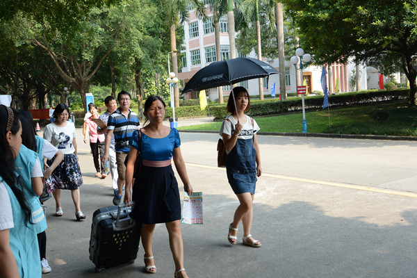 早上7点,在二教中庭已经可以看到英文新生的身影。他们在父母的陪伴下,耐心地等待志愿者们开始迎新接待工作,充满青春活力的脸庞上写满了对新的大学生活的向往与期待。来自湖南的彭同学和她的家长3天之前就来到了广州。“这个校园很漂亮,很有学习的氛围,希望我的女儿能交到新朋友,并且能通过自己的努力实现向往已久的英语梦,”她的母亲周女士热情地讲道。