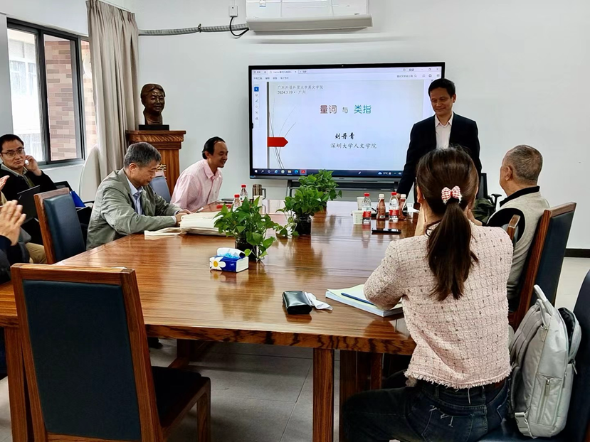 2024年3月19日上午,由广东外语外贸大学英文学院主办的学术讲座在白云山校区第一教学楼北楼446会议室举行。本场讲座主讲嘉宾为深圳大学特聘教授、中国社会科学院语言研究所原所长、《中国语文》原主编、著名语言学家刘丹青教授,讲题为“量词与类指”。讲座由英文学院魏在江教授主持。我院副院长李成团教授,外国语言学及应用语言学研究中心研究员石定栩教授、胡建华教授、马志刚教授,中文学院严修鸿教授,以及来自各学院(研究中心)的师生参加了本次讲座。讲座前,英文学院院长张欣教授、副院长李成团教授会见了刘丹青教授。