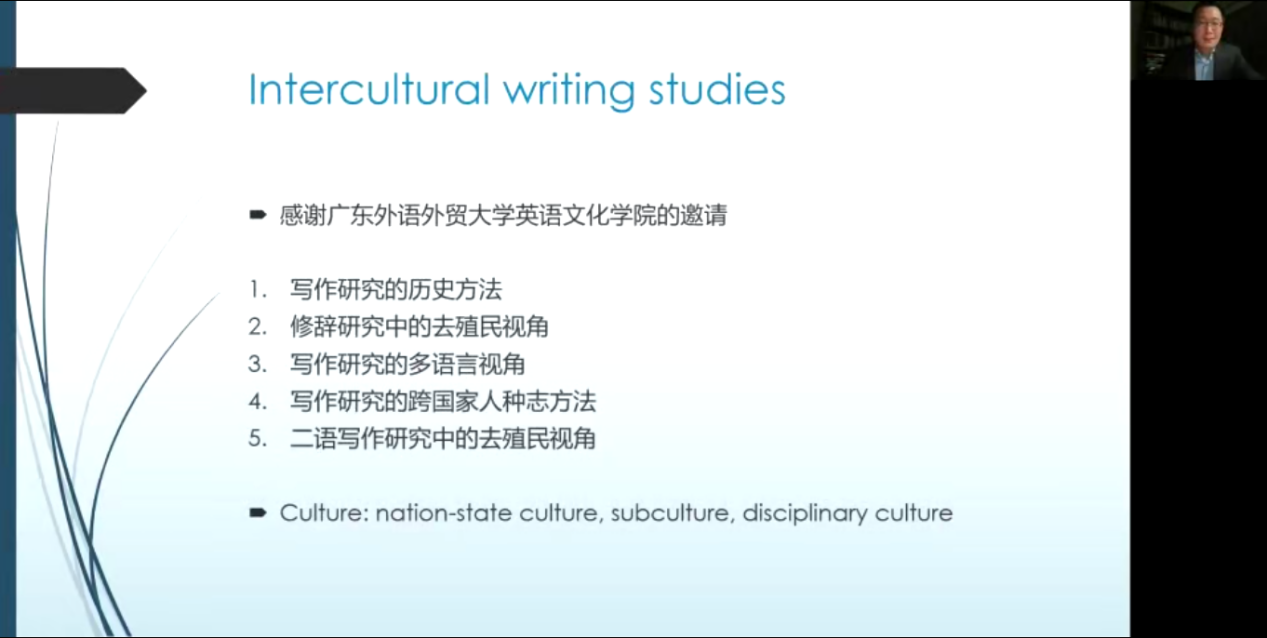 2021年12月25日上午,广东省海外名师项目《跨文化写作研究工作坊系列讲座》最后一次线上讲座圆满举行。本系列一共五次讲座,于2021年11月27日至12月25日期间每周六,在线上腾讯会议平台召开。本系列讲座邀请到美国宾州州立大学文学院英语系和亚洲研究系游晓晔教授主讲,游教授为我们讲述了跨文化语境下的英语写作与教学研究。该系列五次讲座分别由英文学院牛瑞英、许勉君、杜寅寅、潘春梅和梁静璧主持,每次均有一百多位师生参加。