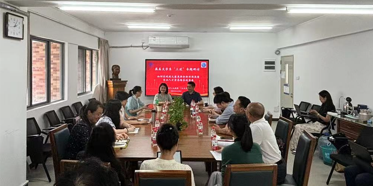本网讯 2024年5月30日14:00,英文学院英美文学系在一教446会议室组织“三进”专题研讨,汕头大学文学院院长毛思慧教授受邀为主讲者,以英语戏剧大赛如何更契合新时期英语专业人才素养培养的需要为题,与英美文学系教师和学工团队教师们展开讨论。英文学院院长张欣教授、副书记王迪老师参与了讨论。研讨由英美文学系主任付晶晶副教授主持。