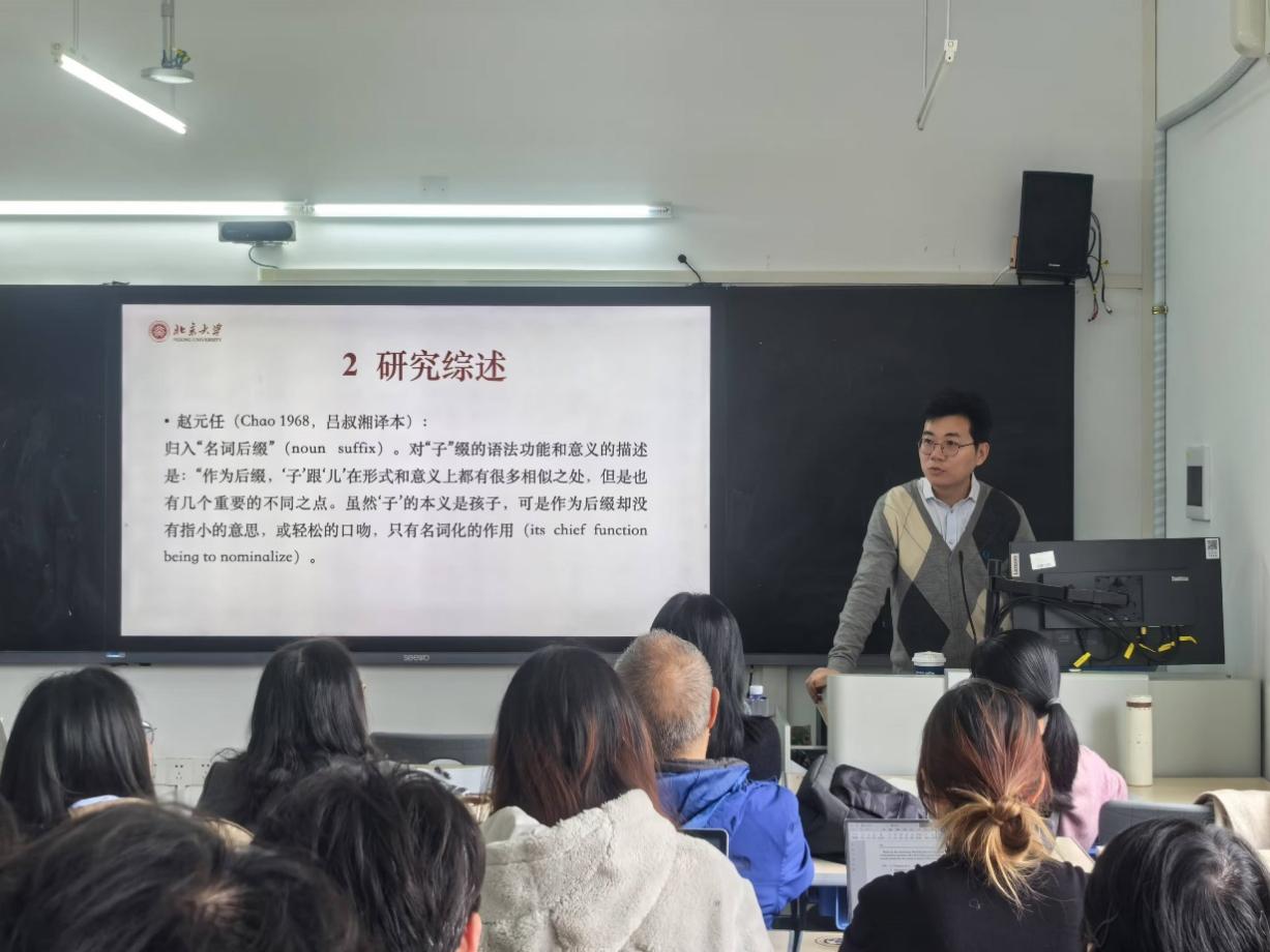 本网讯 2024年12月12日上午10点,北京大学外国语学院外国语言学及应用语言学研究所副所长、长聘副教授、博士生导师、教育部国家级青年人才胡旭辉教授应邀在广东外语外贸大学第一教学楼南楼103教室进行了一场题为“作为词根的词缀--汉语词缀‘-子’的句法属性再探”的学术讲座。讲座由英文学院吴庄教授主持,外国语言学及应用语言学研究中心石定栩教授、胡建华教授、张庆文教授、马志刚教授、程航博士、英文学院陈哲教授、王晓培博士等教师及本、硕、博学生参加了此次讲座,现场座无虚席、精彩纷呈。
