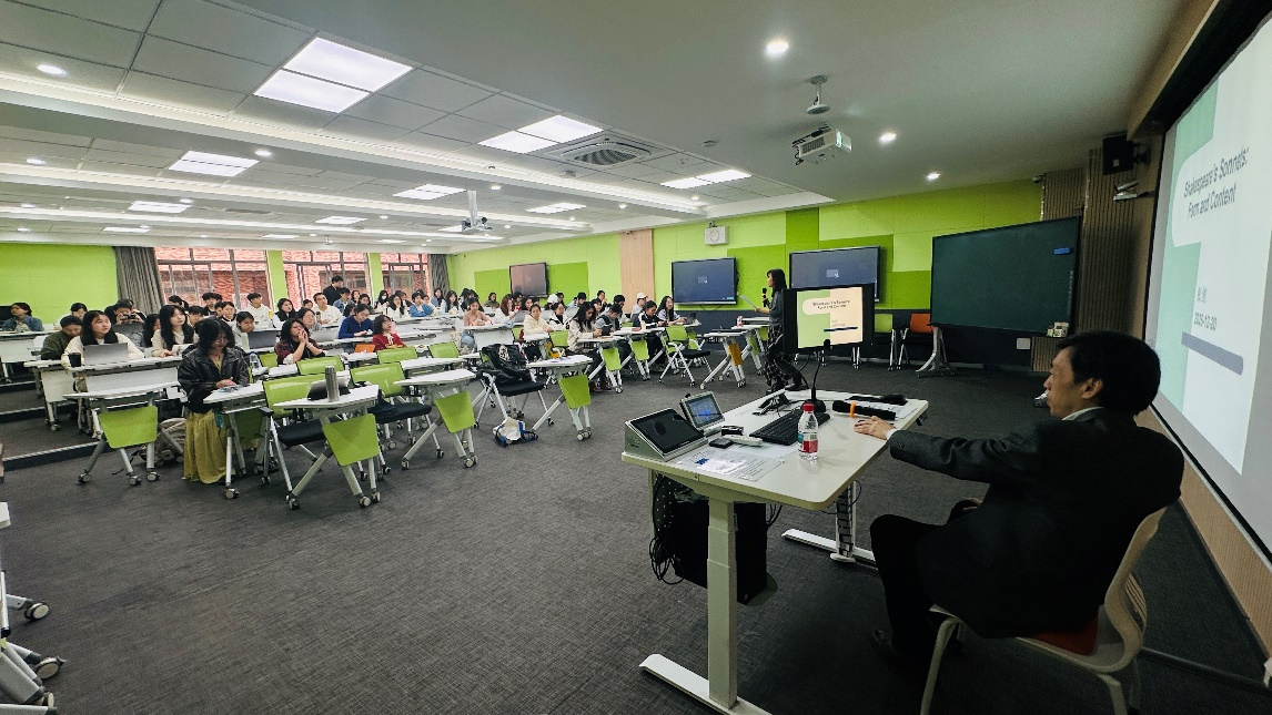 2025年12月19日,由广东外语外贸大学英语语言文化学院爱尔兰研究中心主办的“莎士比亚十四行诗:内容与结构之谜”专题讲座在我校第一教学楼南楼223教室成功举行。《外国文学》主编、北京外国语大学张剑教授担任主讲嘉宾,广东外语外贸大学李元教授主持。讲座现场学术氛围浓厚,互动交流热烈。
